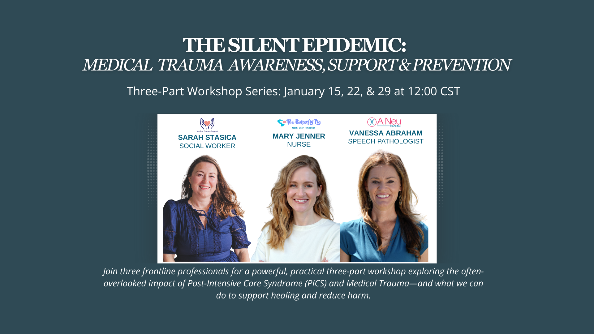 Medical Trauma Workshops and Education Community Conversation Workshops The Quiet Wounds of Medical Trauma - A Community Conversation with Emma Tynan $24.99 Exploring EMDR for Medical Trauma Healing - A Community Conversation with Shelley Freeman, LCMHC, LPC (On-Demand Recording) $24.99 Medical Trauma and Dissociation a Community Conversation with Shakira O'Garro, LMHC-D, LPC, LPCC, NCC $24.99 Previous Workshops THE SILENT EPIDEMIC: Medical Trauma Awareness, Support & Prevention Three-part Workshop Series: January 15, 22 & 29 at 12:00 CST Learn More and Register